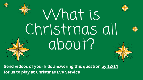 Record your child (horizontally preferred) answering the question, "What is Christmas all about?" Then, upload your video here for us to include in our Christmas Eve Service. Submissions are due by Sunday, December 14th.
